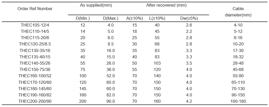 | THEC offers an economical means of sealing the end of power cable with a completely watertight seal. The internal surface of the end cap has a layer of spiral coated hot melt adhesive , which retains its flexible properties after recovery. THEC is recommended for application both in open air and on underground power distribution cables with PVC, lead or XLPE sheaths Effectively offering protection against oxidation, ozone, UV-radiation etc. Coated with hot melt adhesive to ensure environment seal Easily to fit into the cable end Minimum fully shrink temperature: 120 . ℃ |