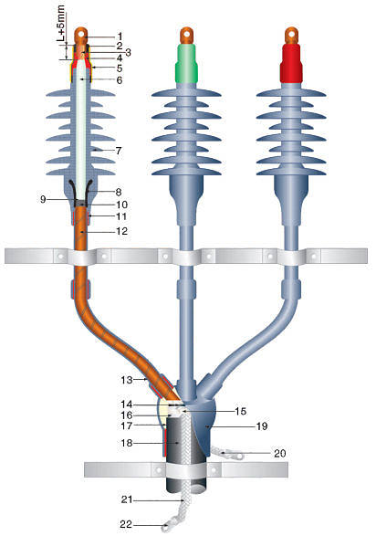 | 1.Connection terminal 2.J-20 self-adhesive tape 3.Wire core 4.Seal gum 5.Chromatography sealed tube 6.Terminal body 7.Main insulating layer 8.Stress cone 9.Semi-conductive tape 10.Semiconductor shielded layer 11.Seal gum 12.Copper shielded tape 13.Cold-shrinkable insulating tube 14.linling 15.Constant force spring 16.Steek armor 17.Filling adhesive 18.Cable outer sheath 19.Cold-shrinkable three-branch sheath 20.Shielded earthing wire 21.Armored earthing wire 22.Earthing terminal L:Hole depth of connection terminal |
