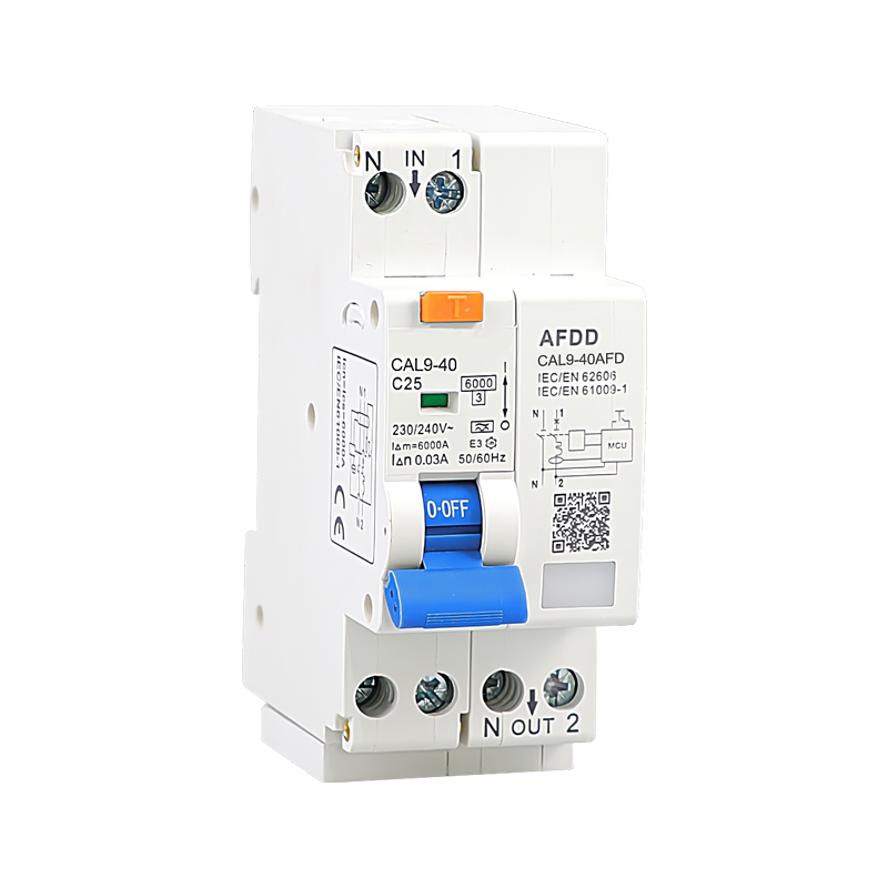CAL9-40AFD is 1P+N(Pole N could be ON/Off arc fault detection devices with integrated RCBO in 6kA breaking capacity, with rated current up to 40A and Sensitivity optional 10, 30, 100, 300mA. LED arc fault indication (During standard operating mode (toggle in ON position), the LED is green. When the toggle is on OFF position or when a fault occurs, the LED is OFF), gray test push button to verify the correct functioning of residual current device. In only 36mm width, they provide protection against arc faults, overload short-circuit and earth fault currents.