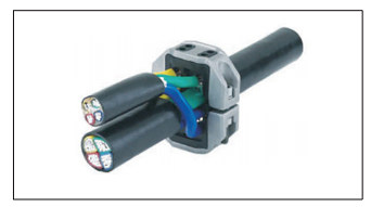 Installation Cable over sheath is removed and the core separators placed between the cores. The two connector halves are positioned over the cores and the bolts are slightly tightened. Stripped ends of branch cores are inserted in the branch channels and the bolts are tightened. The connector halves are closed by tightening the two outer bolts while the contact segment pierces the main cable cores. The outer metal ring is at all times insulated from the life conductors. ·For 4 and for 3 1/2 core cables ·Contact segments with integrated depth limitation ·Branch channels with grooves ·No torque moment key required
