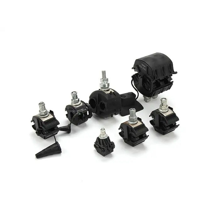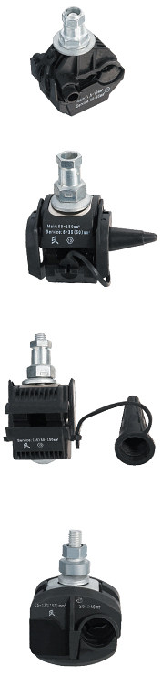 | This type insulation piercing connectors are suitable for all types of LV-ABC conductors as well as connections to service and lighting cable cores. When tightening the bolts, the teeth of the contact plates penetrate the insulation and establish a perfect contact. The bolts are tightened until the heads shear off. Stripping of insulation is avoided. Suitable for aluminum and copper conductors and components not losable, end cap attached to body, Insulation material made of weather resistant glass fiber reinforced polymer, contact teeth made of tinned brass or copper or aluminum, bolt made of dacromet steel. |
