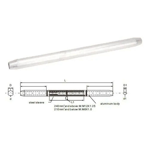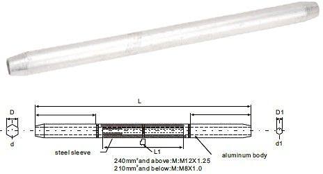 | Full Tension Compression Midspan Joints are manufactured from an Aluminum outer extrusion splice body, and an inner steel tubular core. The two piece design ensures strength equivalent to the conductor onto which the fitting is applied.Each fitting is manufactured with internal and external tapers, to eliminate stresses associated with compression, and reduce corona discharge. Material: Splice Body: Seamless Extruded Aluminum Alloy Tube Steel Sleeve: Plated Steel |